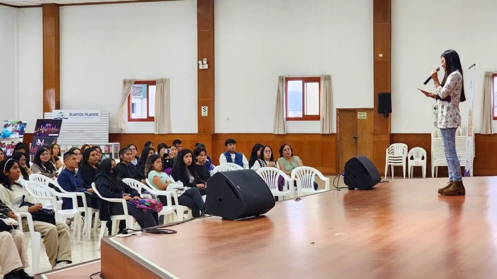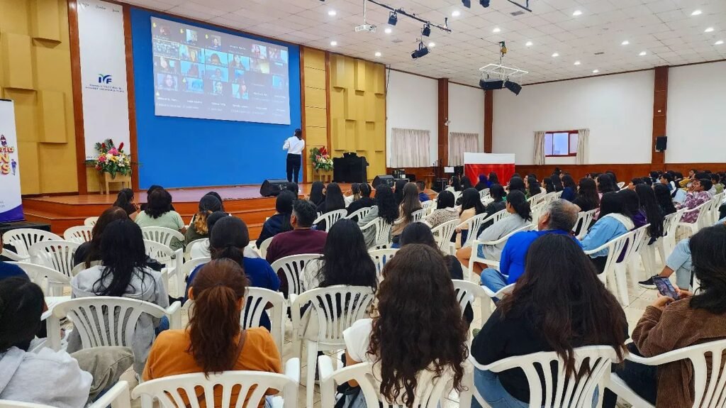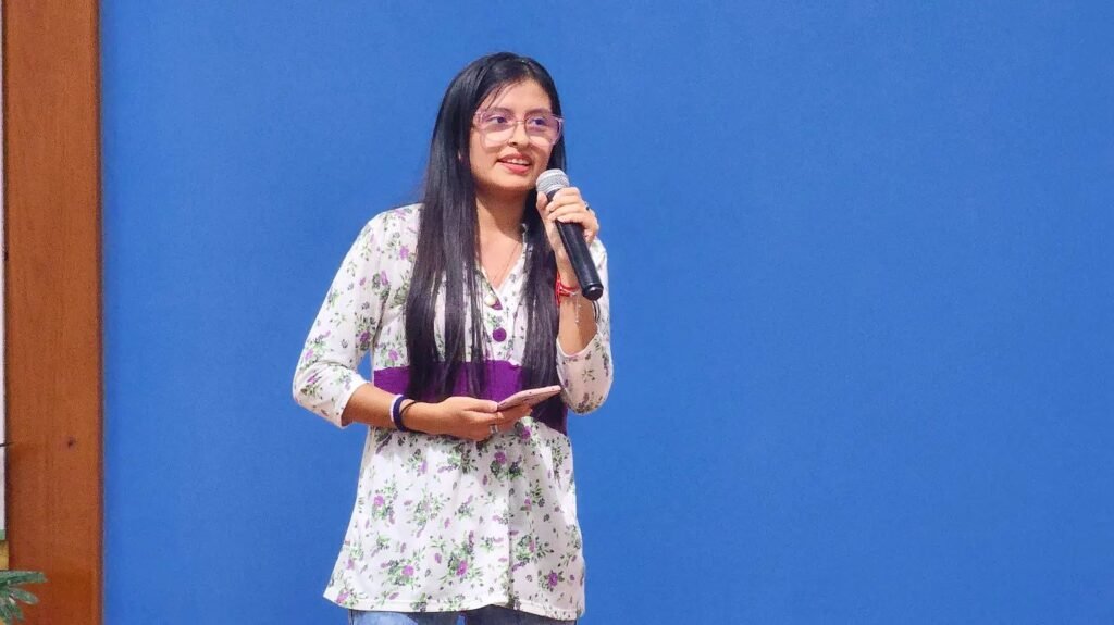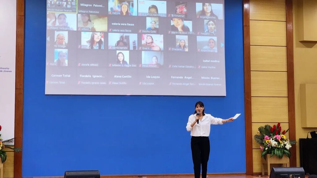 Josselyn Guizado está en el escenario de esta primera convocatoria. Ella relata a los participantes su experiencia en IYF y lo difícil que era salir a expresarse.