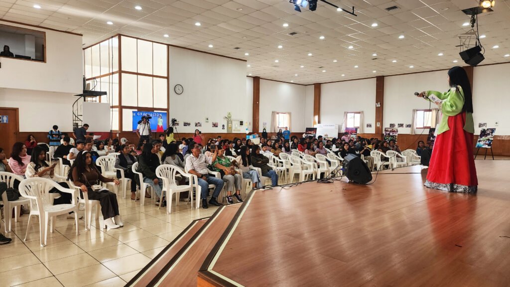 “¡Hola! Estoy agradecida con esta institución porque mi hija está más contenta, antes no era muy sociable, pero ahora viene contenta a estudiar, estudia coreano. Antes tenía curiosidad de aprender, pero ahora ya sabe algunas palabras. Tiene ánimos de hablar y de conocer ese país. Estoy muy agradecida con este programa”.