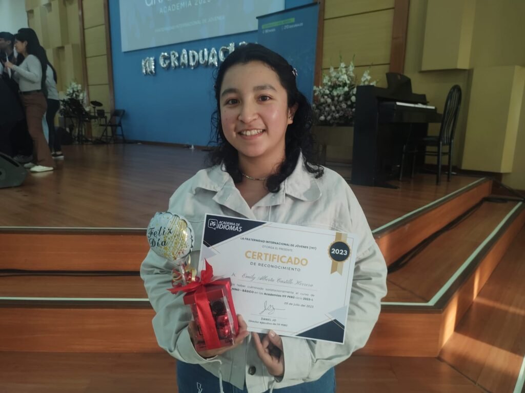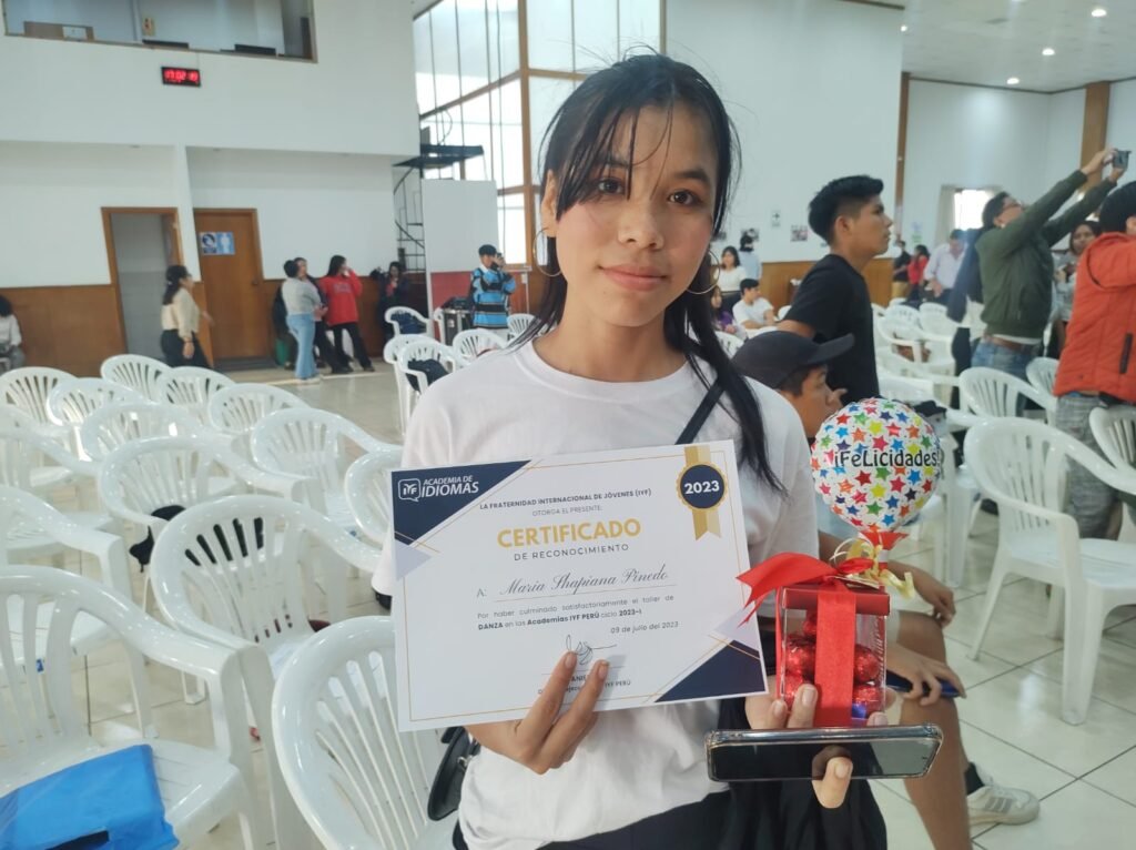 “¡Hola!, chicos. ¡Qué tal! estuve en academia de IYF. Mi experiencia fue muy buena, la clase y el profesor fueron muy amables y pacientes, y la verdad me llevo una muy linda experiencia, porque siento que con la perseverancia uno puede alcanzar varias cosas. Incluso yo llegué sin saber nada, y los profesores son súper amables, te explican paso a paso como hacer las cosas. Yo creo que, si te propones a hacer algo, lo vas a lograr”.